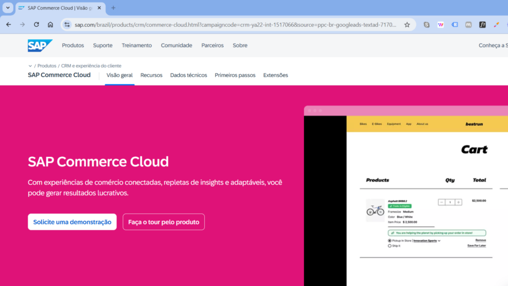 A SAP Commerce Cloud, anteriormente conhecida como Hybris, é uma plataforma robusta que integra soluções de e-commerce, CRM e ERP. Reconhecida pela sua escalabilidade e suporte a operações omnichannel, é amplamente utilizada por grandes corporações globais. Baseada na nuvem, a ferramenta permite customizações avançadas e oferece suporte para vendas B2B complexas.